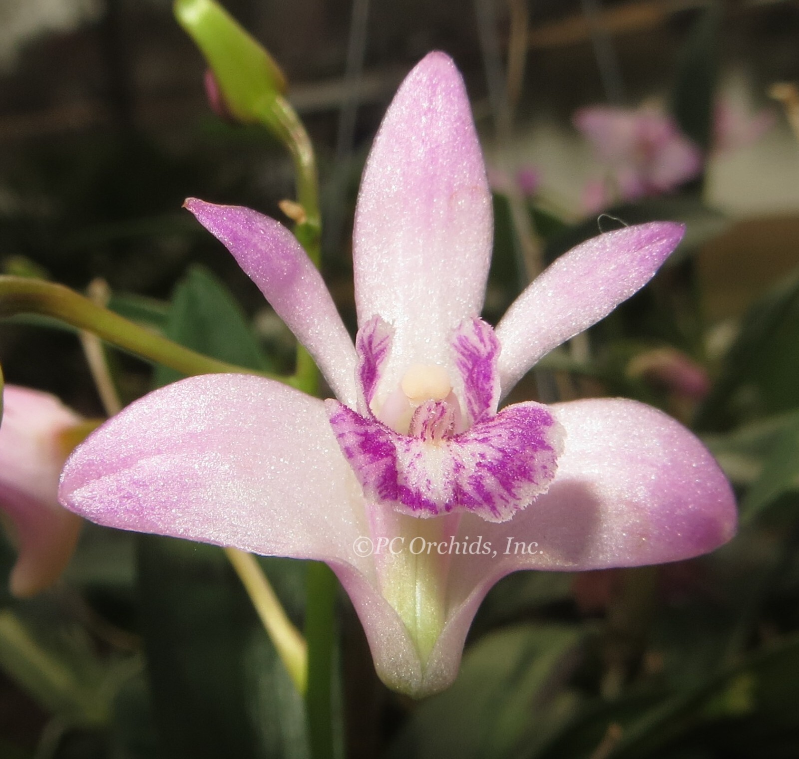 Orchid care with regard watering and humidity is most easily achieved when the plant roots are well ventilated, as is the case with these plants hanging in the Brooklyn Botanic Garden, NYC. Photo Allison MeierWatering orchids indoors is not an exact science, and will depend heavily on local climatic conditions, and whether the plant is in a growth period. But it is not hard to take care of potted orchids watering requirements. Simply have a feel of the media. Unless it is almost dry a few inches down, the plant will not need watering. Have a look at the roots. Epiphytic orchids will tell you when they want to be watered. If they are green, it is a sure sign the plant is not thirsty. If the roots are silver, however, the plant can be watered. Simply pour a small jug of water through the pot. Water should ideally be around ambient temperature, not too hot or too cold. It does not matter how much water you pour through, as the water will immediately drain away. In the home, this is best done over a sink, as the many slots and holes in the orchid pot will let all water escape, leaving the moist media, and hopefully no water-logging. A really dry plant can be allowed to sit in a container of water to have a good soak. However once watered, orchid pots should never sit in a dish of water. If plants are hung, for example in a greenhouse, they may be simply watered in situ where they should drain perfectly. At this point, aerial roots can also be misted, turning immediately from silver to green as they absorb the moisture. In really hot conditions, and especially for larger plants, your orchid may occasionally require more water. The orchid can be placed in a container of water, pot-deep, for 5-10 minutes to have a really good soak. This is fine, as long as the media drains adequately on it's removal.