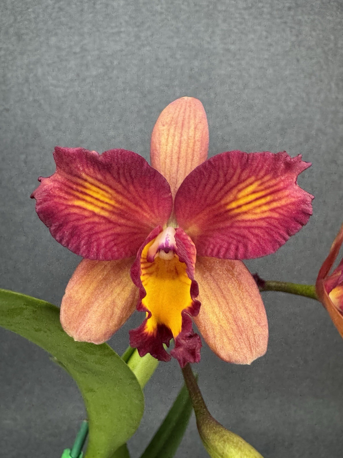 Flower buds usually appear in sheaths: leaf-like structures that grow from between the leaf and pseudobulb. The buds, and ultimately flowers can take quite some time to emerge from the sheath. When the last flower has fallen from your Cattleya orchid, it is a good idea to cut the flower spike all the way down the stem. If you want to help the plant sealing the wound, you can apply melted candle wax or some cinnamon powder.