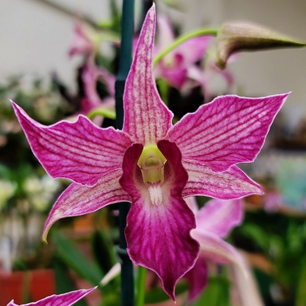 Dendrobium canes vary from species to species, but some can get very tall. Because these epiphytes are used to growing with their roots in quite cramped conditions (for example the cracks in rocks), they like a small pot. These two facts can create a slight challenge for some Dendrobium plants, in that they become somewhat top-heavy. Plastic pots tend not to offer the weight to support a tall specimen, though they can be placed inside a planter in order to give them extra support. Larger canes may require some propping up, especially when the plant is newly repotted - bamboo stakes are perfect, whilst smaller plantlets can be bunched lightly with other stems with lightly tied string.