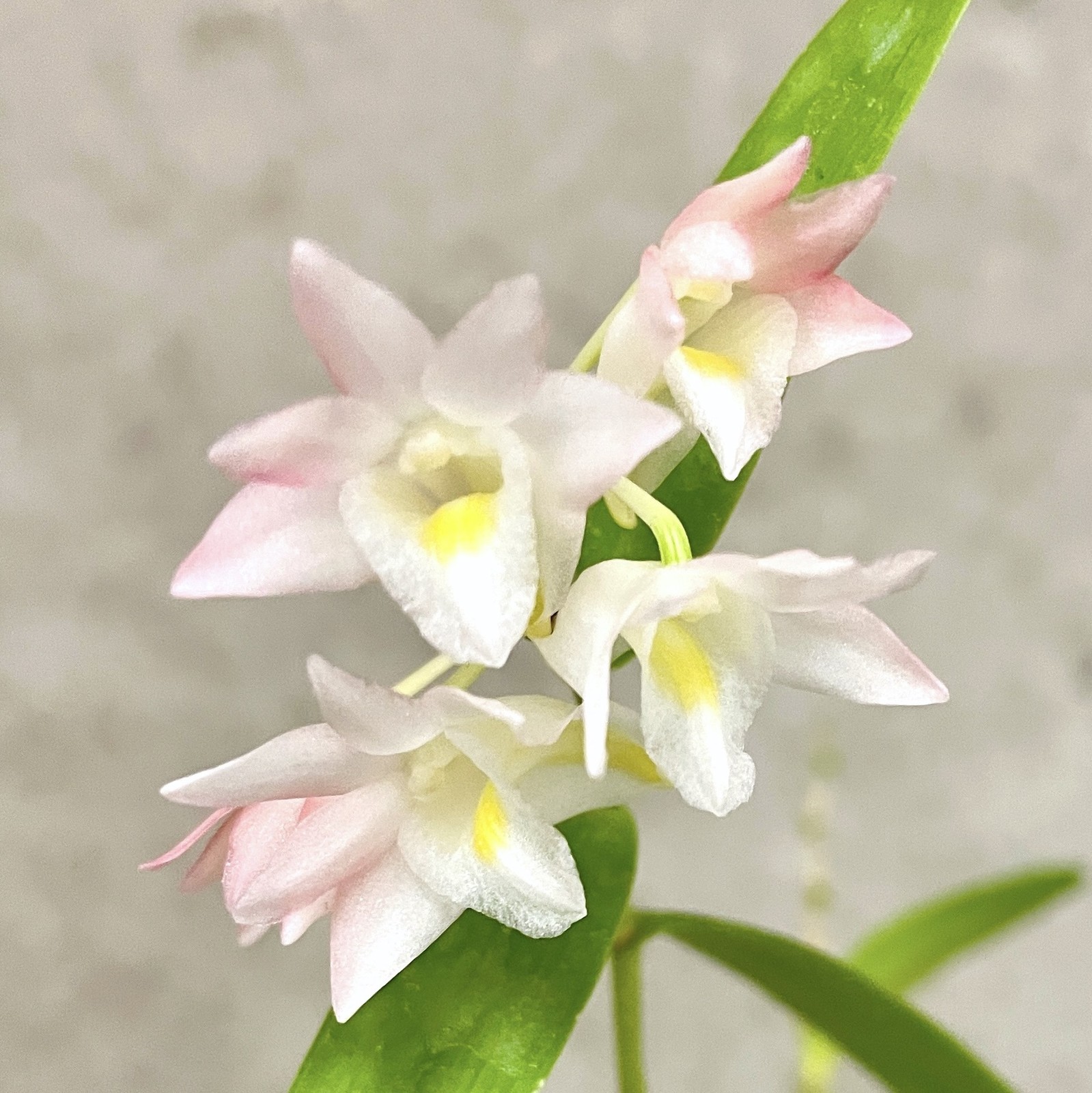 This 'hard cane' Dendrobium hails from tropical forests in the very north east corner of Australia and New Guinea, so has less seasonal variation than Dendrobium nobile, below. It likes a warm bright environment, and regular feeding during the growing period; the winter rest period does not need a significant temperature drop to encourage flowering, though feeding should stop, and watering should be reduced; perhaps replaced by misting, unless the leaves or canes start to shrivel.